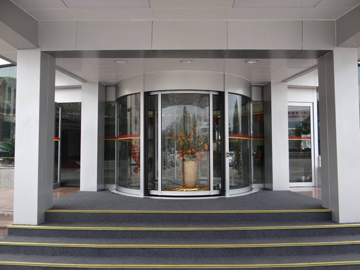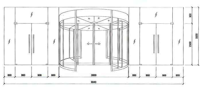 两翼旋转门为主的门区方案 兴泰两翼全自动旋转门直径范围3.4~4.8米,内部行走空间大,行人通行量大,外形美观漂亮。适用于 大型建筑和公共建筑。行政大楼、金融、商务楼、宾馆、饭店等使用。 主门选择和配置的要求: 1、两翼旋转门直径大小的选择应该适用于建筑的行人流量要求。 2、进口高度的确定应该符合门区整体设计风格,应该小于中2.8米。 3、旋转门位置应考虑建筑物内部空间大小和外部行人、车辆通行要求。 4、侧门配置应该防风和密封。 5、满足消防通行的要求。 6、在相同直径时,为提高通行能力,主门可采用简易两翼旋转门代替三翼旋转门。 7、表面可采用不锈钢包饰或氟碳喷涂处理(按照RAL色标)。